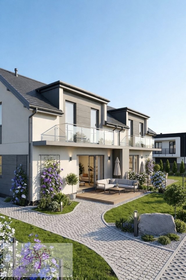 Marzysz o własnym domu z ogrodem, który łączy nowoczesną architekturę z funkcjonalnością? Prezentujemy ofertę sprzedaży domu w zabudowie bliźniaczej, realizowanego według popularnego i cenionego projektu „Dom w klematisach 27 (B)” biura Archon. Dom składa się z 5 pokoi, 2 łazienek, kotłowni, garażu.