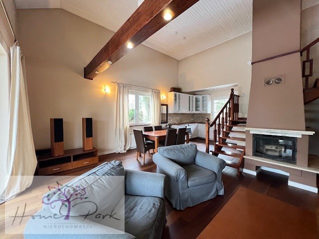 Salon z kominkiem - robi niesamowite wrażenie nie tylko z uwagi na swoją wielkość, ale przede wszystkim wysokość sklepienia - 4,2 metra wysokości - na podłodze drewno egzotyczne - merbau.