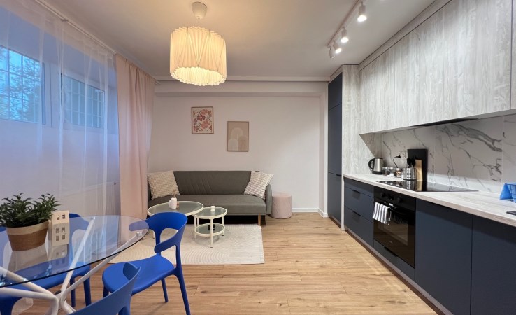 Powierzchnia mieszkania to 63 m2, składa się z pokoju ok. 24 m2, sypialni ok. 12m2, kuchni z meblami w zabudowie, łazienki razem z wc.