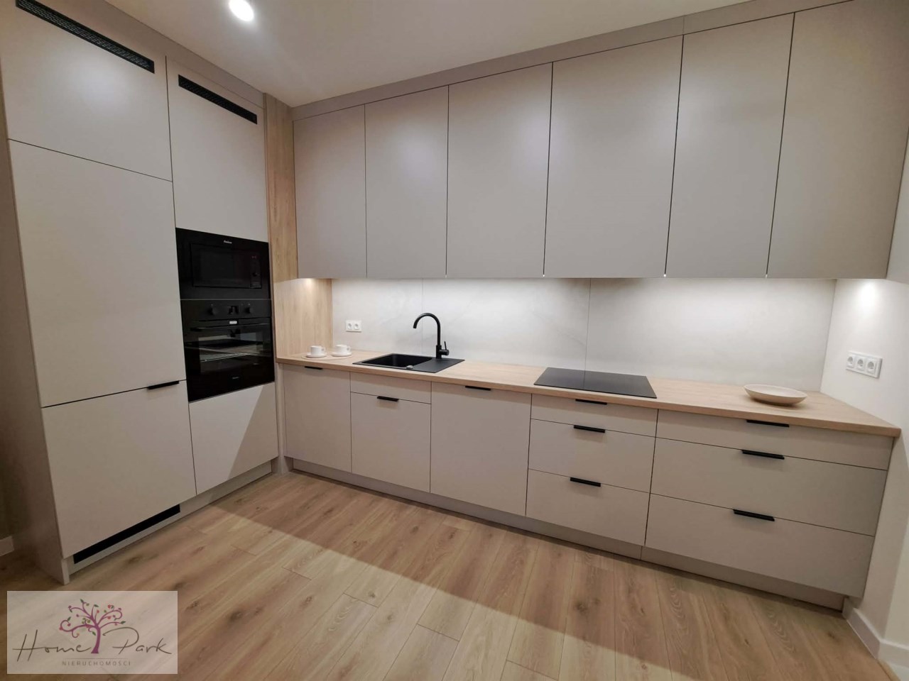 Aneks kuchenny wyposażony jest w sprzęt w AGD w zabudowie: płyta indukcyjna, piekarnik, mikrofala, lodówka z zamrażarką, okap, zmywarka i zlewozmywak.