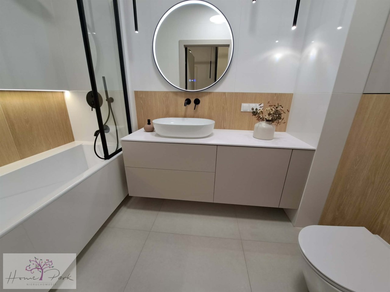 Łazienka i WC w jednym pomieszczeniu. W łazience: wanna z parawanem, panel prysznicowy z deszczownicą, umywalka nablatowa z szafką i WC podwieszane.