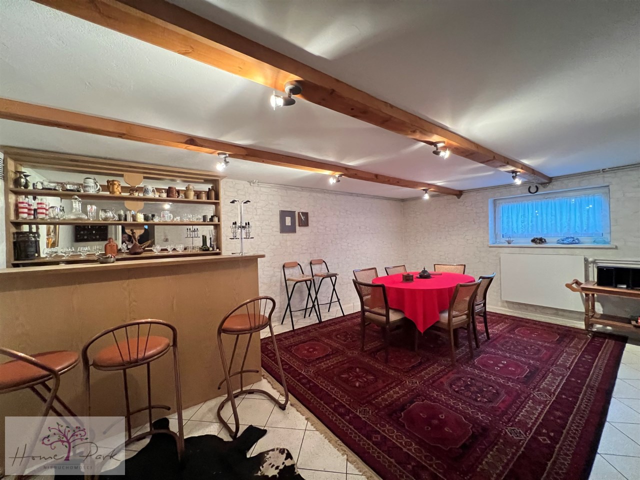 piwnica - przyziemie, wysokie, przestronne . Znajdują się tutaj: kotłownia, pralnia-prasowalnia, gabinet/biuro , sypialnia, oraz " męska jaskinia " lub inaczej - pokój gier i zabaw .