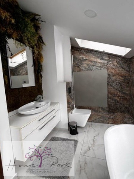 Łazienka z kabiną prysznicową, umywalka, toaletą i wanną wolnostojącą.