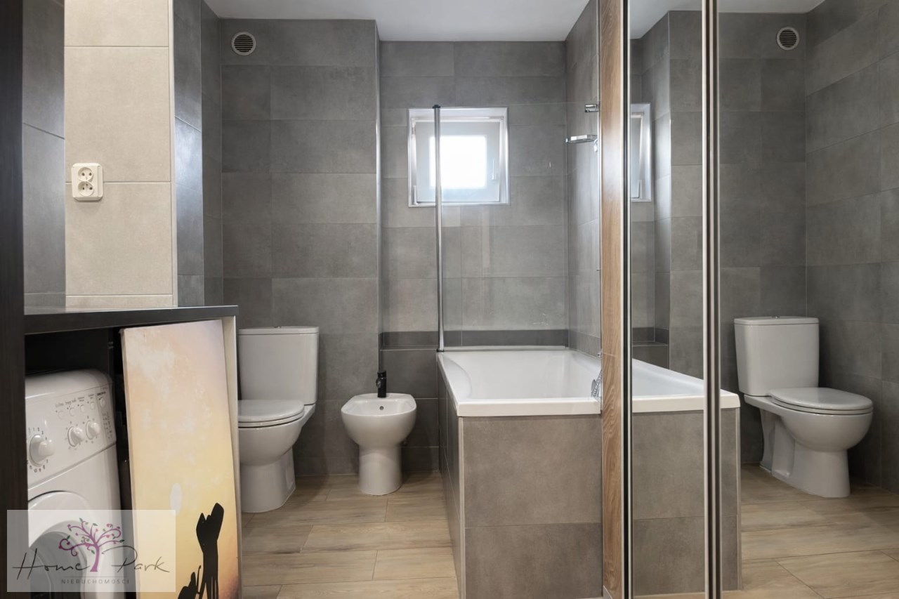 Wykończona w dobrym standardzie – wanna z funkcją prysznica, bidet, elegancki blat z konglomeratu oraz duża szafa z lustrami.