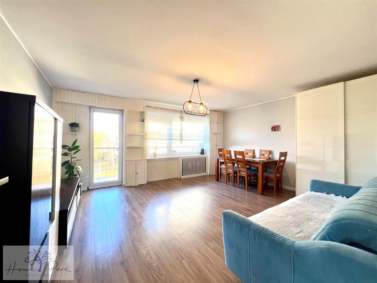 Salon o pow. ok. 25m2 z wyjściem na duży balkon. Wystawa okien - zachód.