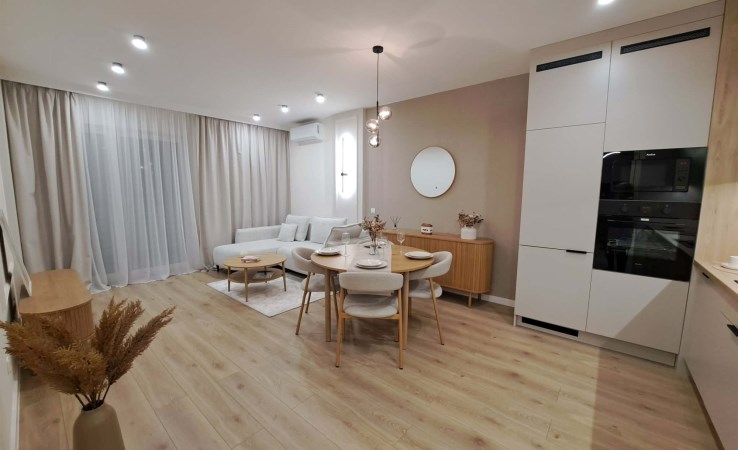 • Przestronny salon z aneksem kuchennym: Miejsce, gdzie można swobodnie wypoczywać i cieszyć się wspólnym czasem z rodziną i przyjaciółmi. Kuchnia wyposażona w nowe sprzęty AGD.
